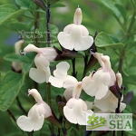 (Snowflake Sage) Wiry, trailing stems of small white leaves make this plant look like fresh snowfall. Numerous, small, sky blue flowers with prominent bee lines further add to the cooling look. This dry-garden plant is native to the mountains of the Chihuahuan desert of North Central Mexico.